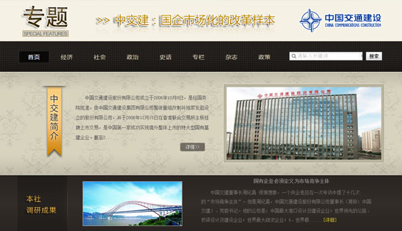 負(fù)責(zé)中國交建專題頁面的設(shè)計制作,該頁面以黑色為主色調(diào),加以棕、黃為點(diǎn)綴加以突出,符合企業(yè)特點(diǎn),體現(xiàn)企業(yè)沉穩(wěn)、安全、實(shí)力雄厚。整個設(shè)計,簡潔,大方,彰顯企業(yè)實(shí)力。